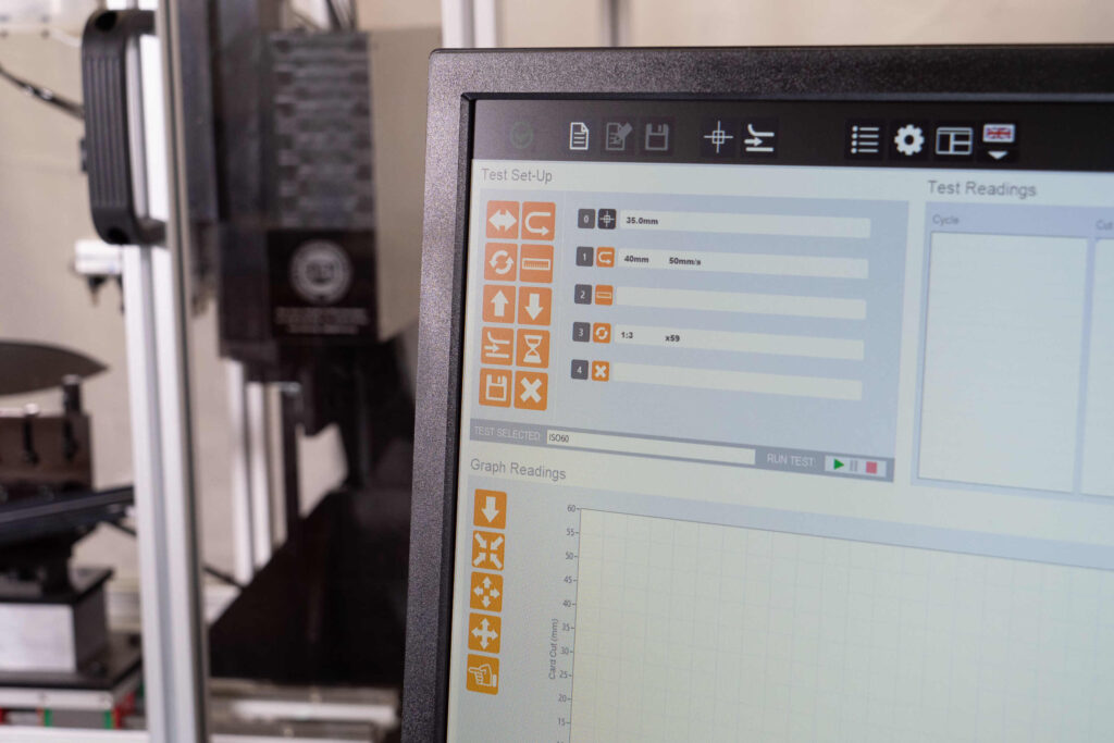 The cutting-edge to be tested is mounted vertically and a pack of specially developed synthetic card is lowered on to it. By moving the blade back and forth repeatedly, the blade cuts into the paper; the depth of the cut being the measurement of sharpness. The test card is loaded with 5% silica, which has a mild wearing effect on the blade edge. The measurement of cut depth at each subsequent stroke can then be plotted to produce a wear curve for each blade tested.